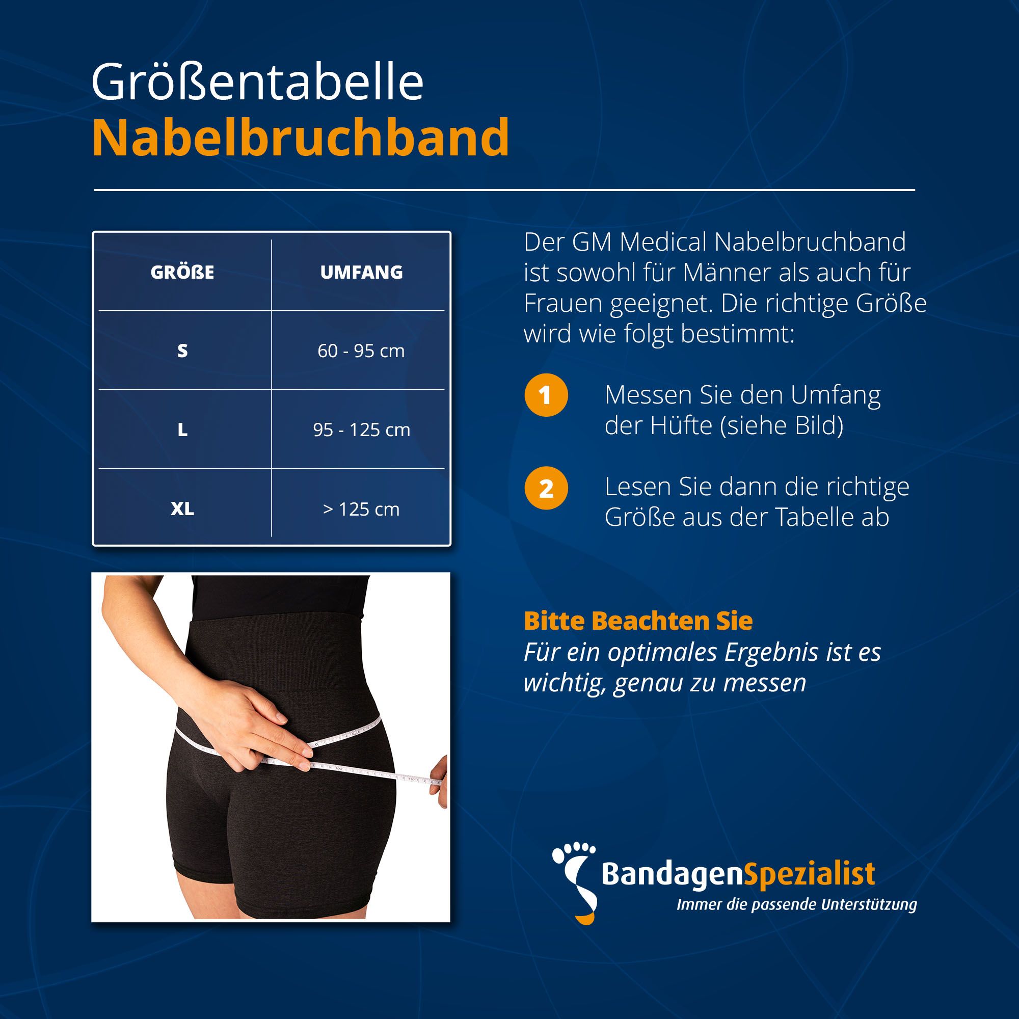 Das GM Medical Nabelbruchband übt kontrollierten Druck auf den Nabelbereich aus und hilft, die Vorwölbung zu stoppen oder zurückzudrücken. Die integrierte Pelotte (Druckpolster) unterstützt die Heilung und verhindert eine Verschlimmerung der Hernie. Dieses Nabelbruchband kann auch ohne Pelotte getragen werden und eignet sich daher auch für andere Beschwerden, bei denen Druck im Bauchbereich gewünscht ist.